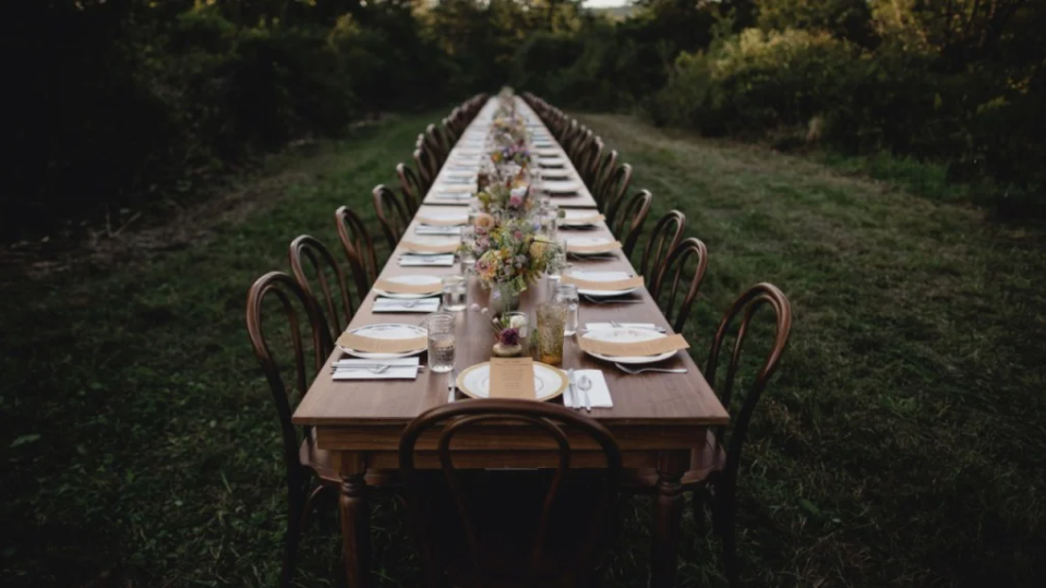 Captions for a photo essay highlighting the Harvest Moon Dinner at Enos Farms, community meals at Troy Farm, and Harvest in Madison, WI.